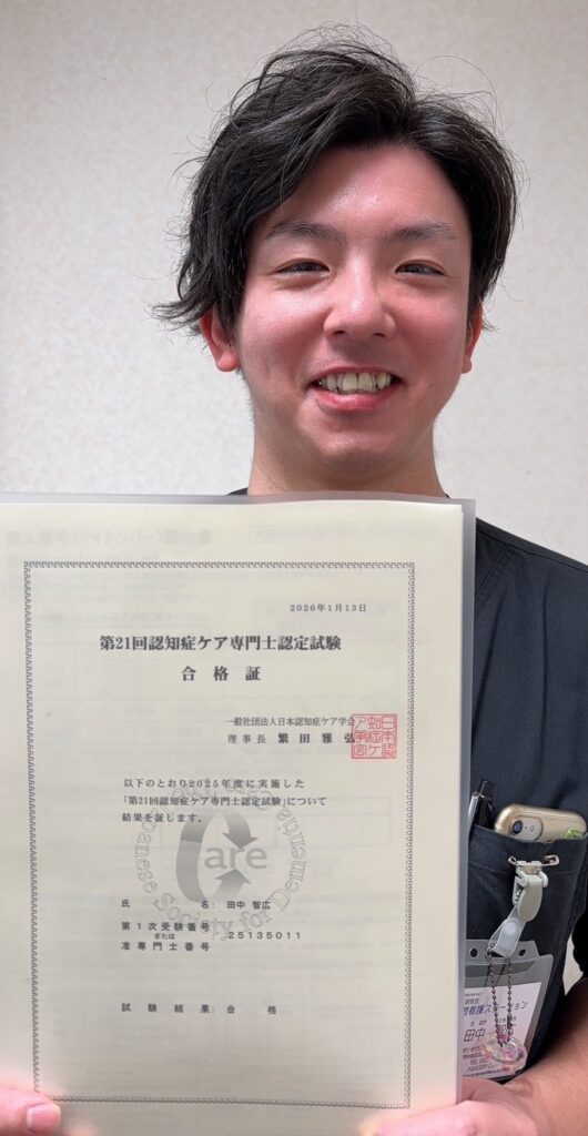 浜浦町訪問看護ステーションの田中看護師が、認知症ケア専門士の資格を取得しました。