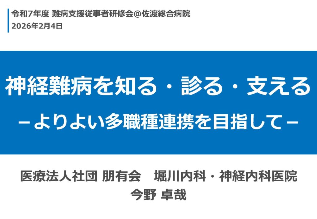 2月4日、佐渡保健所主催の令和7年度難病支援従事者研修会で、「神経難病を知る・診る・支える -よりよい多職種連携を目指して-」と題して講演をしました。